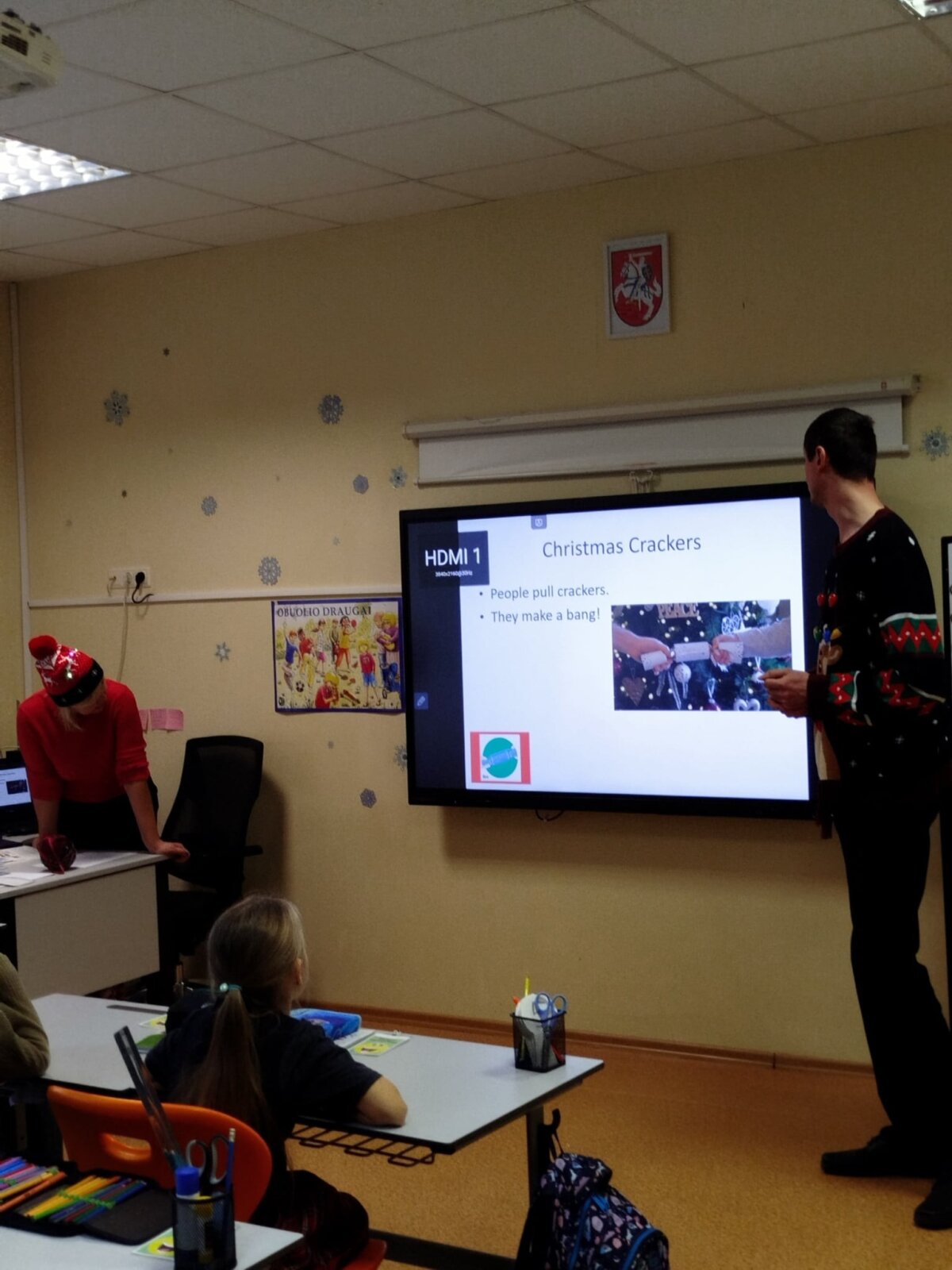 Tematem lekcji były Święta Bożego Narodzenia oraz tradycje w Polsce, na Litwie i w Wielkiej Brytanii. Dzieci z zaangażowaniem porównywały zwyczaje, uczyły się nowych słówek, pisały listy do Świętego Mikołaja, oglądały film, układały puzzle i dekorowały bombki. Wielką niespodzianką była wizyta Świętego Mikołaja w Landwarowie, która wywołała mnóstwo uśmiechów i radości.