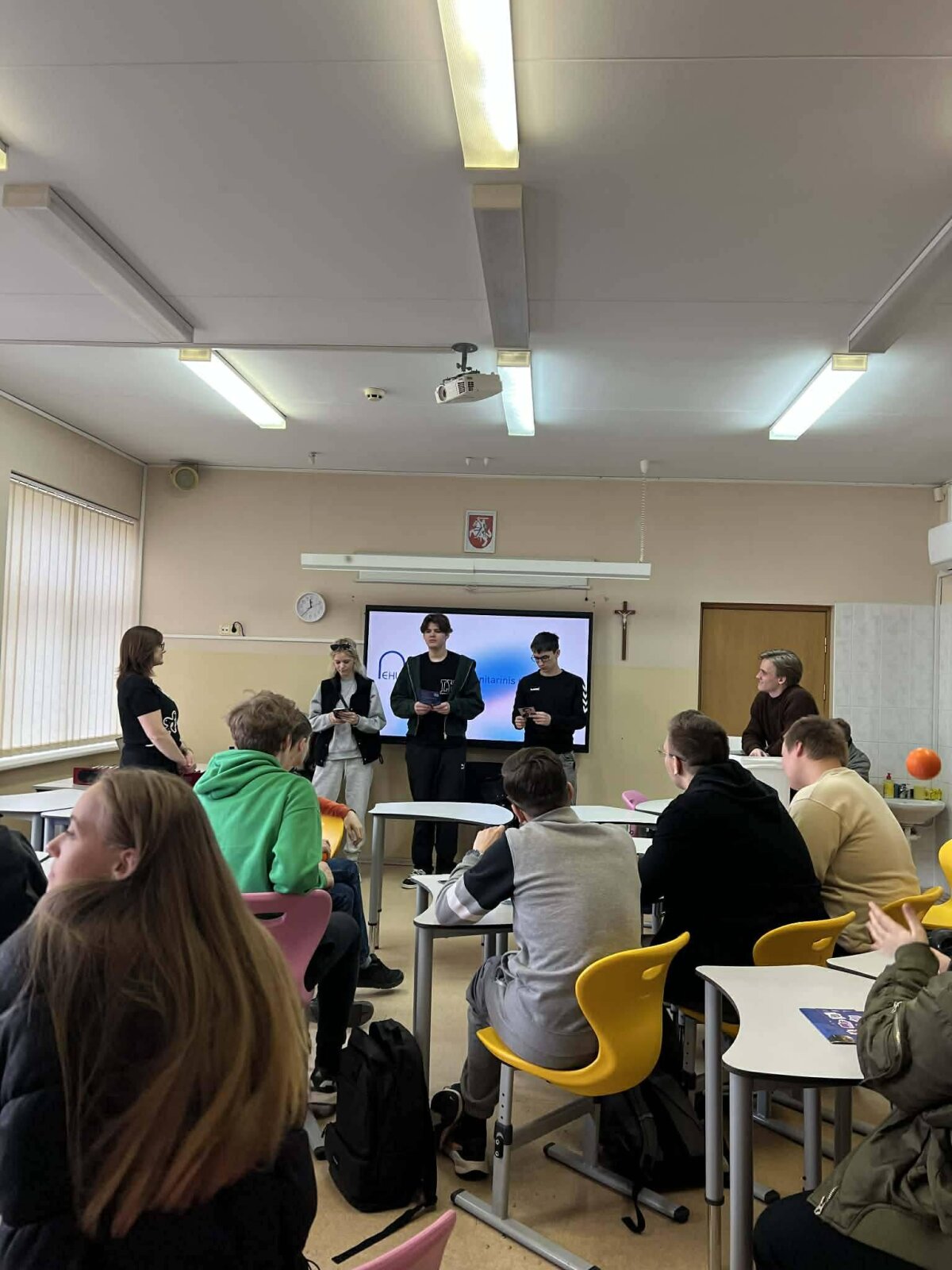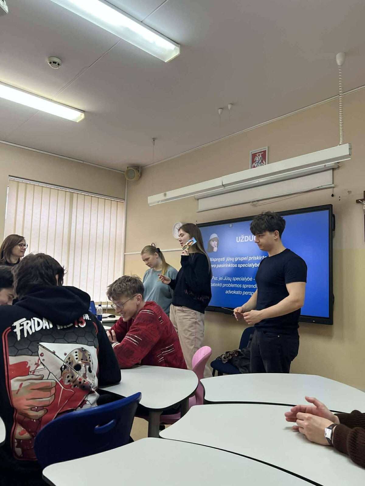 Mokiniai ne tik klausėsi pristatymo, bet ir aktyviai įsitraukė į interaktyvią veiklą – dalyvavo komandiniame žaidime. Pagal savo temperamentą gavę tam tikras profesijas, jie turėjo kartu spręsti universiteto atstovų pateiktą problemą. Ši užduotis skatino kūrybiškumą, bendradarbiavimą bei padėjo geriau pažinti save.