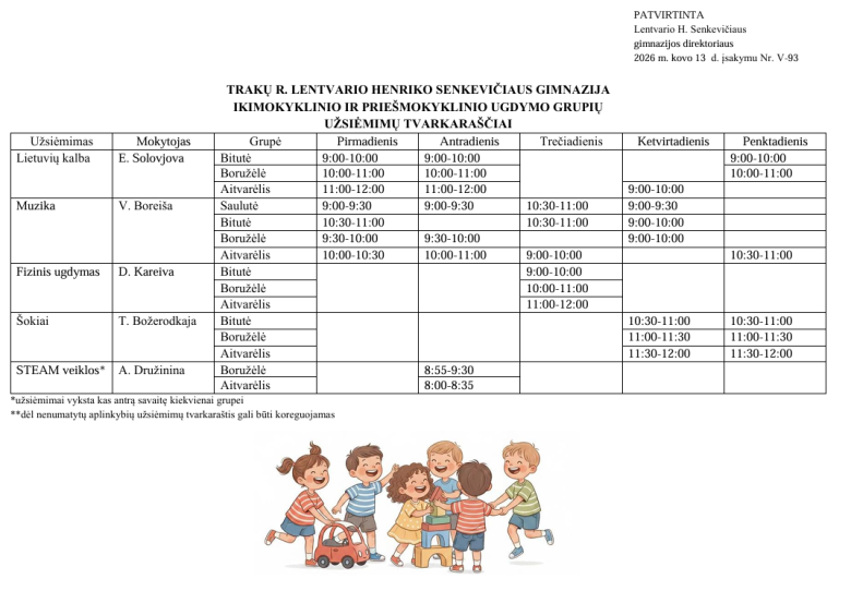 Priešmokyklinio ugdymo organizavimą mokinių atostogų metu, primename, kad vadovaujantis Trakų rajono savivaldybės tarybos 2022 m. vasario 23 d. sprendimu Nr. S1E–27 patvirtinta priešmokyklinio ugdymo tvarka, mokinių atostogų metu grupės dirba ir priima vaikus, grupėje vaikams organizuojamas laisvalaikis, žaidimai (priešmokyklinis ugdymas pagal programą neorganizuojamas). Mokinių atostogų metu priešmokyklinės grupės lankymas nėra privalomas, tačiau mokykla privalo užtikrinti vaikų, kuriuos tėvai atveda, priėmimą ir vaikų užimtumo organizavimą grupėse savivaldybės nustatytą grupės darbo laiką.