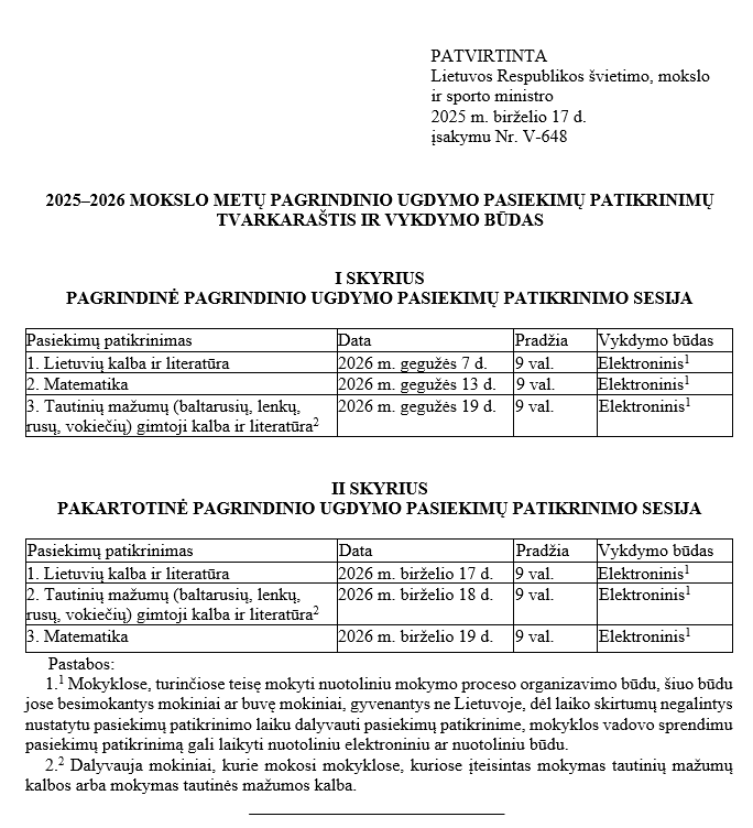 2025-2026 MOKSLO METŲ PAGRINDINIO UGDYMO PASIEKIMŲ PATIKRINIMO TVARKARAŠTIS IR VYKDYMO BŪDAI